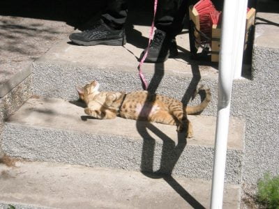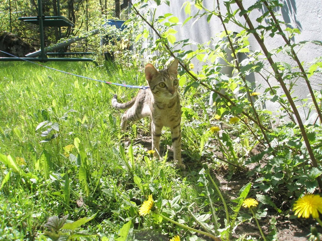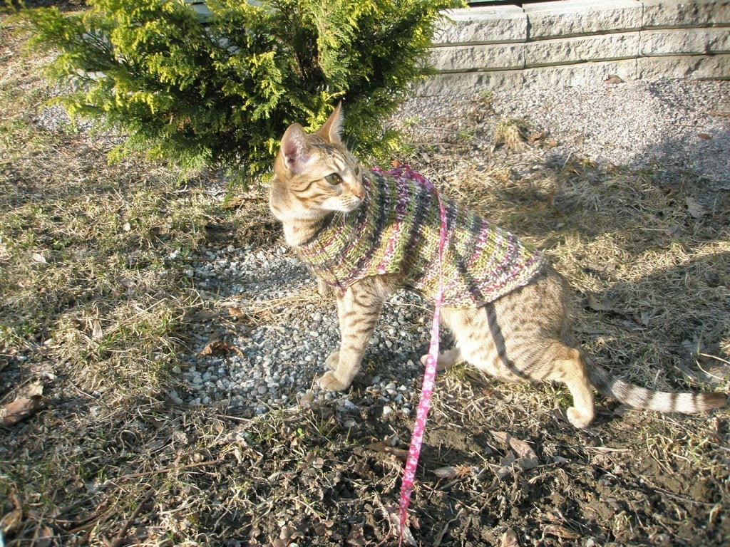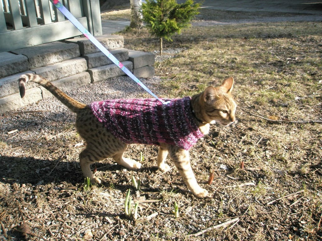 Kissat ovat tottuneet pääsemään valjaissa pihalle melkein joka päivä. Tyttöjen mielestä varmaan pitäisi käydä monta kertaa päivässä ulkoilemassa, mutta meidän ihmisten monien rajoitteiden takia olemme joutuneet tyytymään vähempään. Huhtikuussa oli vielä niin kylmä, että ohutturkkiset ocicatit tarvitsivat lisälämmikettä. Kiitoksia äidilleni kauniista ja lämpimistä villapaidoista! Ansa sai vihreäkirjavan: