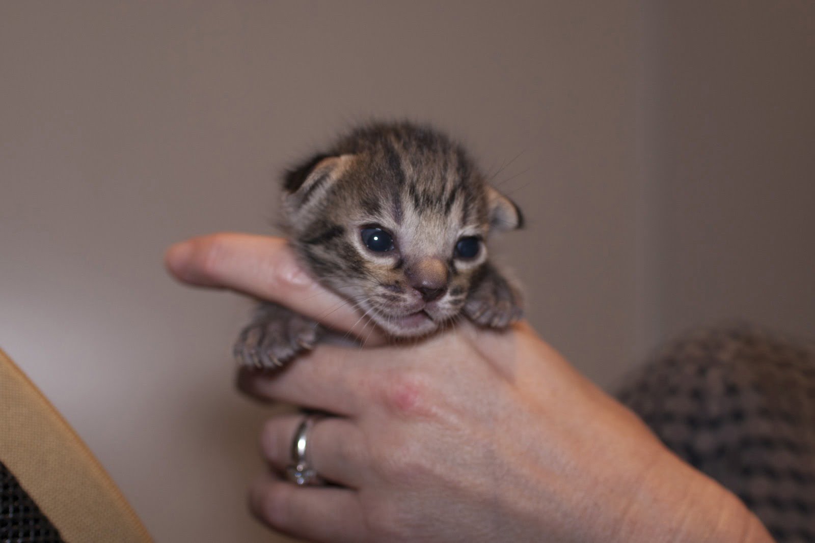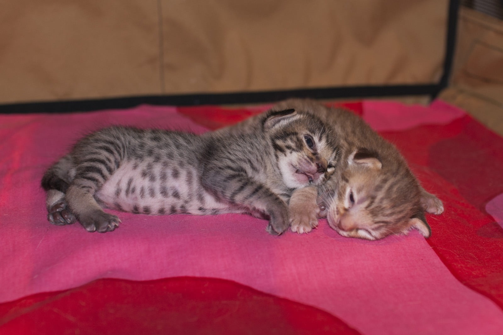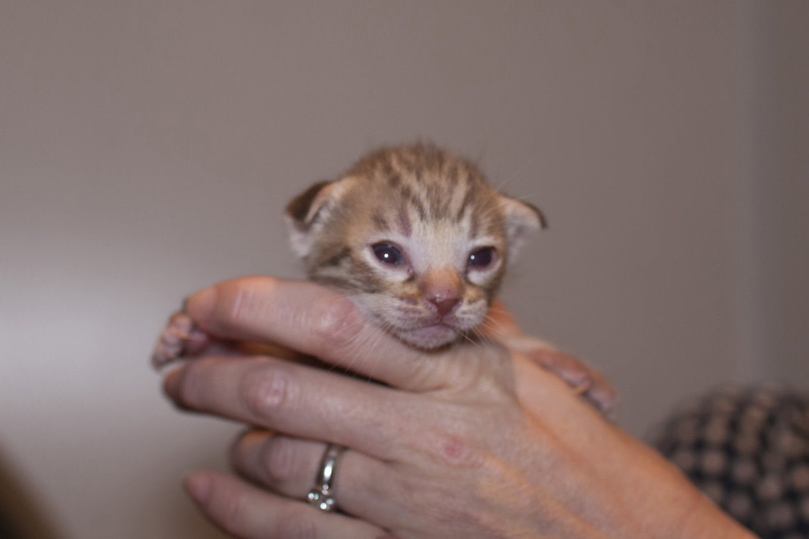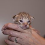 The kittens are now two weeks old, and everything is going well. The little ones opened their eyes at the age of one week and one day. Both are real lovely looking, with round heads and small ear flaps. After one more week, the ears canals should be opening, and then we shall wait when the boys start to explore outside the nest.