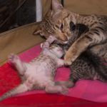 previous evening Lily showed still no signs of the approaching delivery, but in the night at 3 a.m. she delivered easily and quickly her two boys. Like her mom Tara, Lily seemed to be an excellent mother, very meticulous and caring. The kittens’ birth weights were 100g and 101g, very good weights.