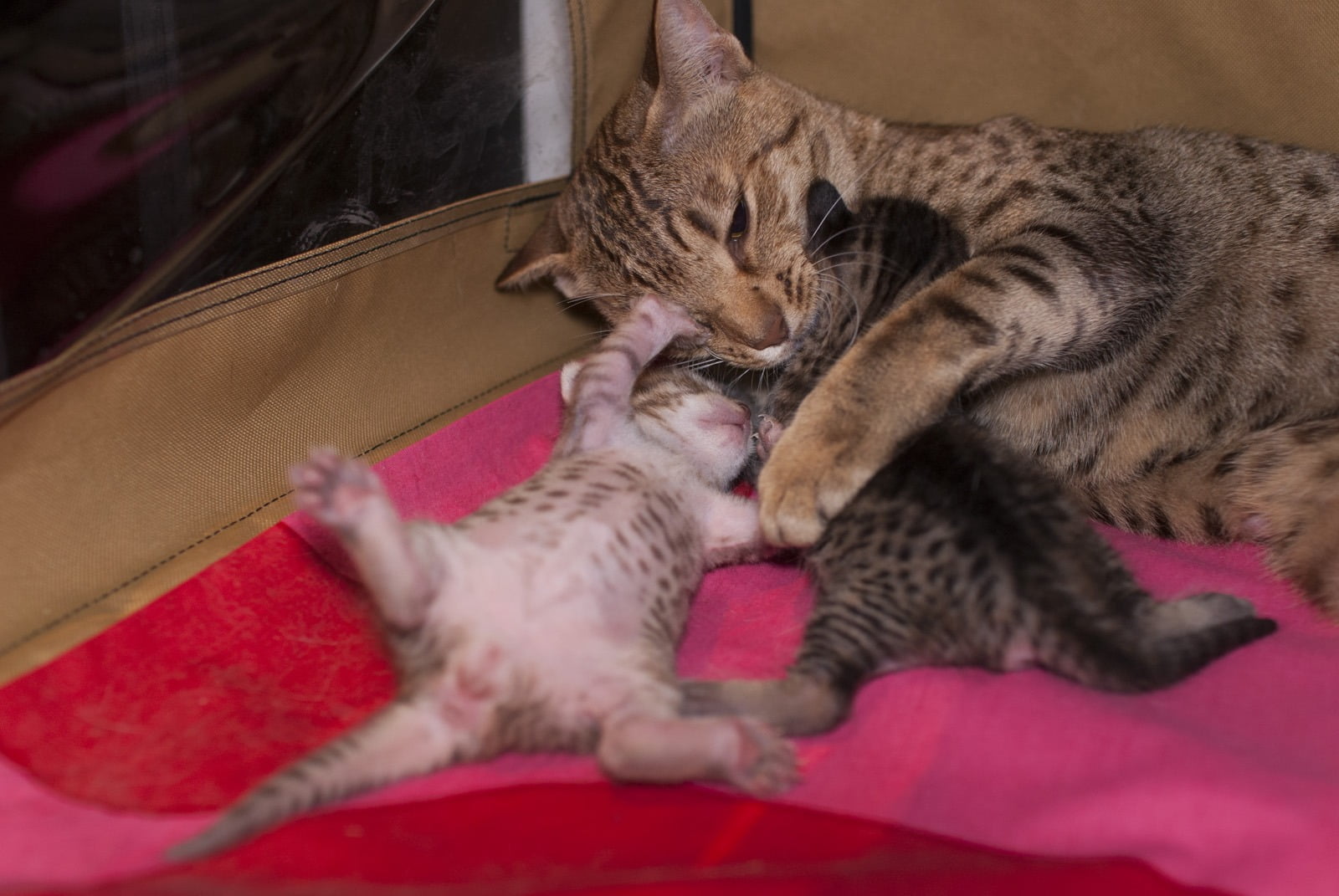 On Friday 27th of June 2014, exactly on the due date, Lily (IC Northalla Peridotite) gave birth to two kittens: tawny and chocolate spotted boys. On the